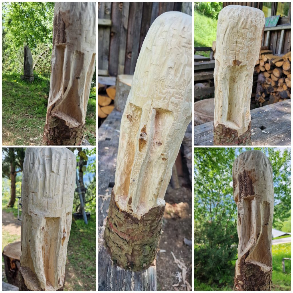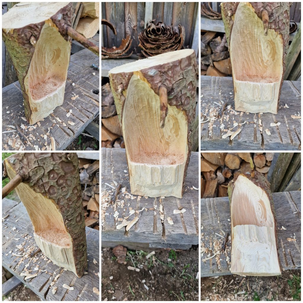 Jetzt ging uns alles schon viel schneller und routinierter von der Hand. Wir kannten das Werkstück jetzt mit allen Astlöchern, feuchten und trockenen Stellen und wie sich das Holz beim Verarbeiten verhielt. Nun ging es zügig in deutlichere Formen und Ausarbeitungen über. Durch diese Erfahrungen kam es zur Änderung einiger Pläne. Die Waschbärenidee vom Anfang wurde geändert. Jetzt sollte es eine Teelicht-Dekorationsarbeit werden.