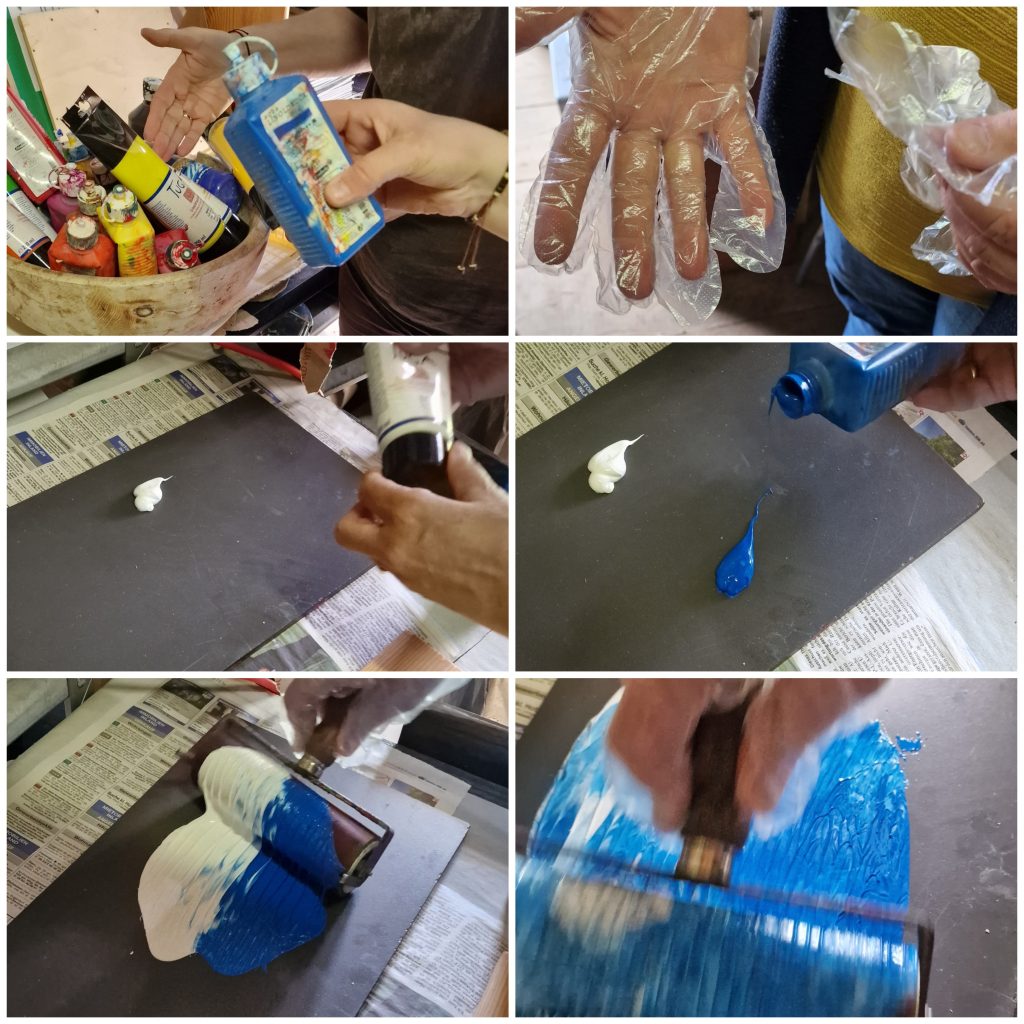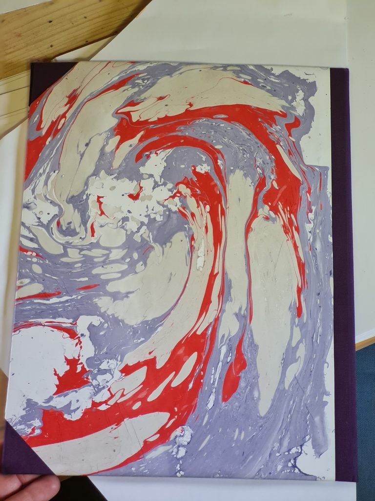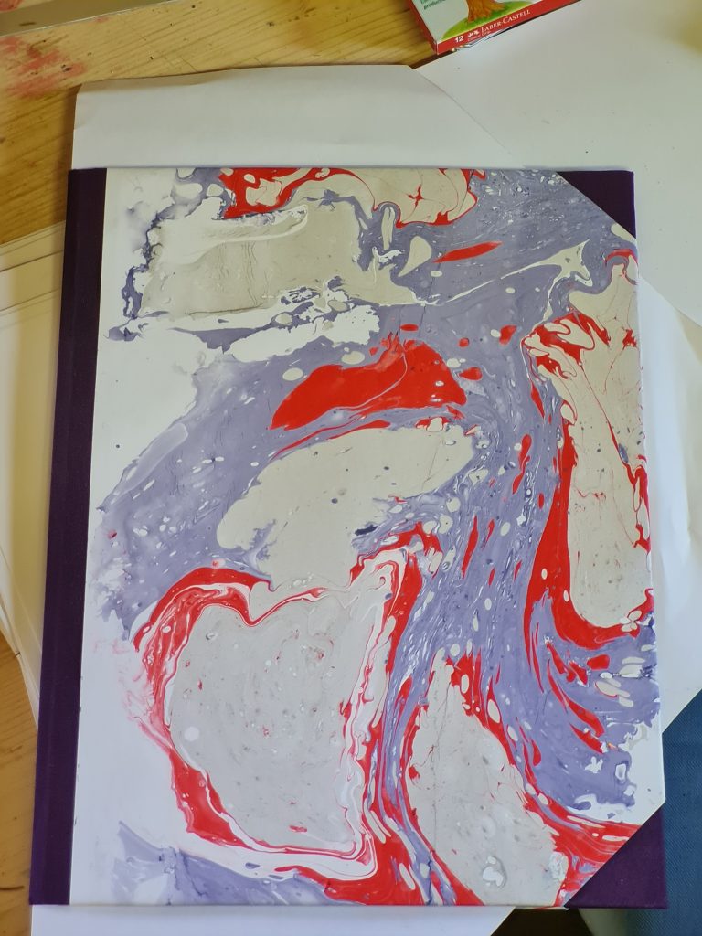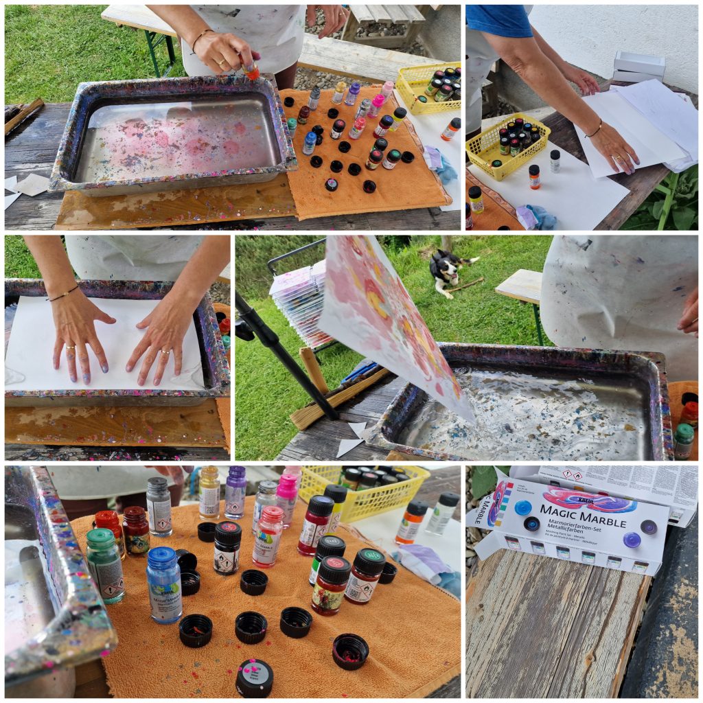Hier zum Beispiel marmorierte  Magdalena Papier mit Marmorierfarbe. Daraus fertigen sie Abschlussmappen für die Schüler in Pauls Schule.