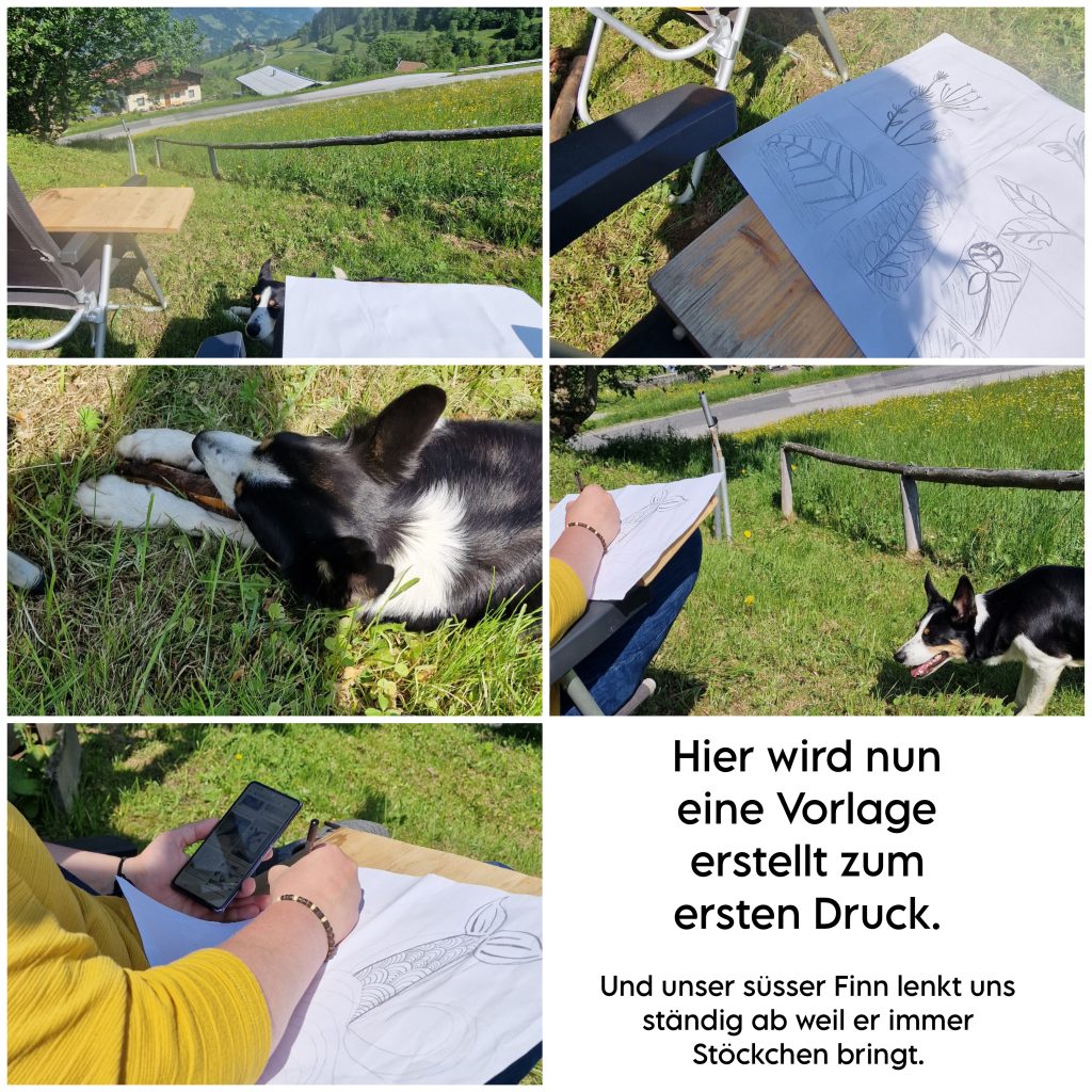 Nun begannen wir auch für unser Linoleum uns Motive auszudenken und holten uns Inspiration in der Natur. Wir saßen mitten wunderschöner Wildblumen und zeichneten drauf los.