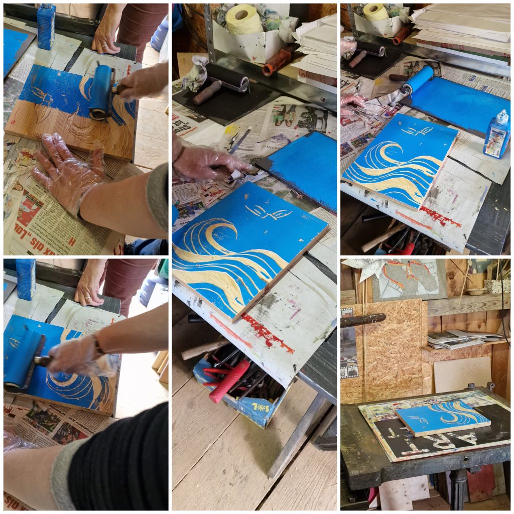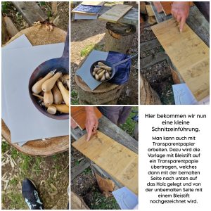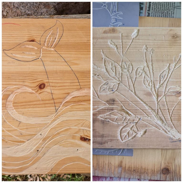 Beim Holzdruck wir nun zuerst der Teil aus dem Holz entfernt, der am Ende des Druckvorgangs weiß sein soll.
